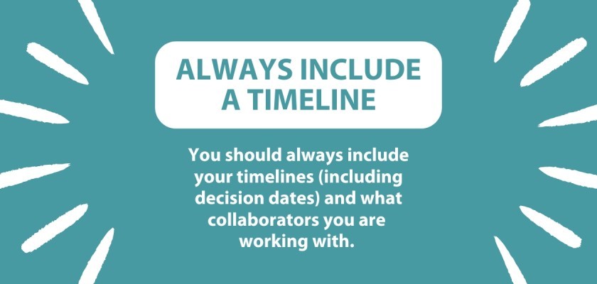 You should always include your timelines (including decision dates) and what collaborators you are working with.