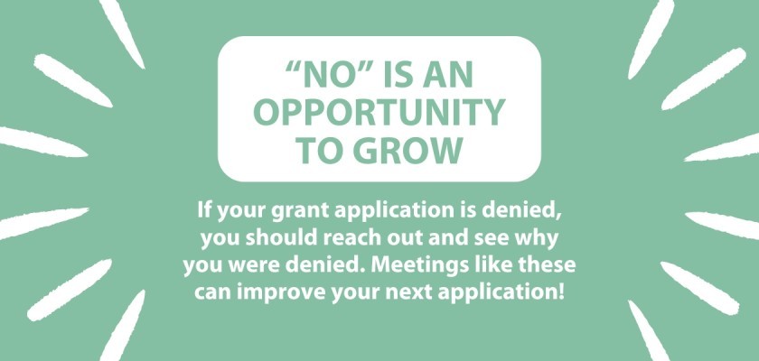 Remember that a “no” is an opportunity to grow. Even if you are denied, you should still reach out to the grantmaker and see what might improve your next application. Even though every application is different, most grantmakers will give valuable advice for your next application.