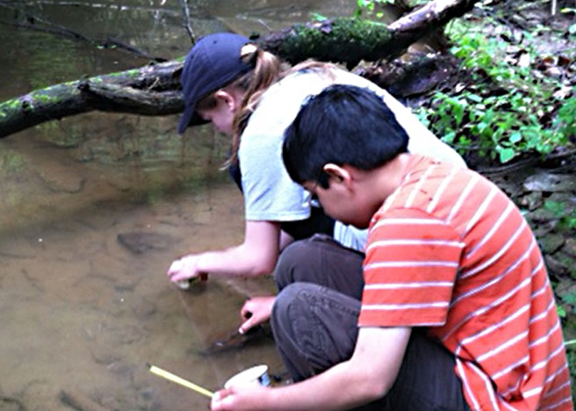 Audubon campers crouch by the edge of a muddy creek // Photo courtesy of Audubon Society of Western Pennsylvania