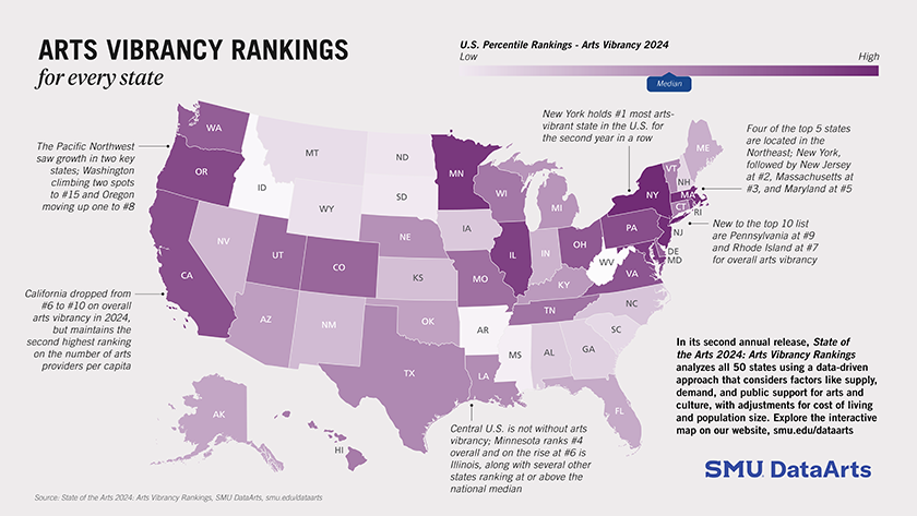 This week, SMU DataArts, the National Center for Arts Research, released its second annual Arts Vibrancy State Rankings, and I am thrilled to share that Pennsylvania has secured a place among the top 10 states for the first time. Moving from twelfth position in 2023 to ninth in 2024 is a testament to the strength, creativity, and dedication of our state’s arts and culture sector.