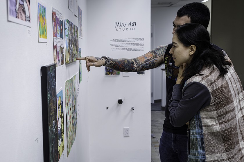 Patrick Fisher and María Nuñez view artwork on display at VaultArt Studio, which supports and promotes the inclusion of artists with disabilities. // Photo by Maranie Rae