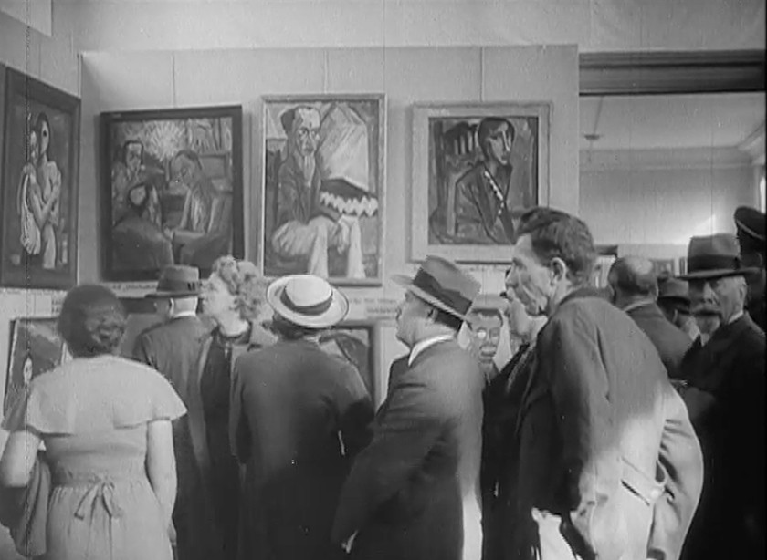The 1937 exhibit of ENTARTETE KUNST in Munich, featuring paintings of modern artwork declared by the Nazis to be "degenerate" // Still from a film clip accessed at United States Holocaust Memorial Museum, courtesy of Library of Congress