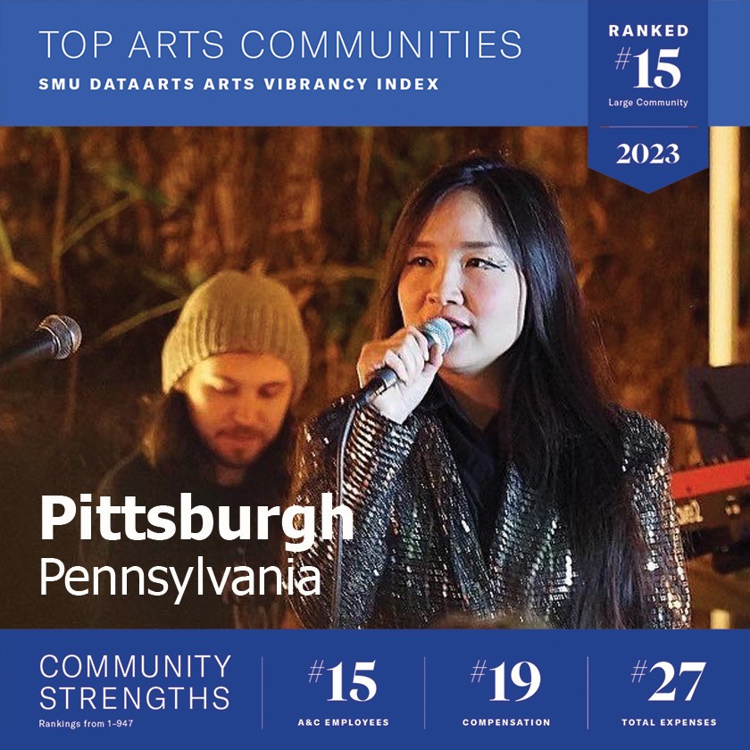 SMU DataArts, the National Center for Arts Research, today released its 8th Arts Vibrancy Index, which identifies Pittsburgh as number 15 in the list of 20 Large communities in the United States through an analysis of the level of supply, demand, and government support for the arts in more than 900 communities across the country. Organized into three separate lists based on community population size, totaling 40 communities across the country, this year’s Arts Vibrancy Index is the first to include numerical rankings since 2020, a reflection of arts organizations returning to in-person activities and performances following the easing of pandemic restrictions. Pittsburgh is returning to the Arts Vibrancy Index for the first time since 2018 and is ranked fifteenth on the annual list of the top 20 most arts-vibrant large communities across the nation.