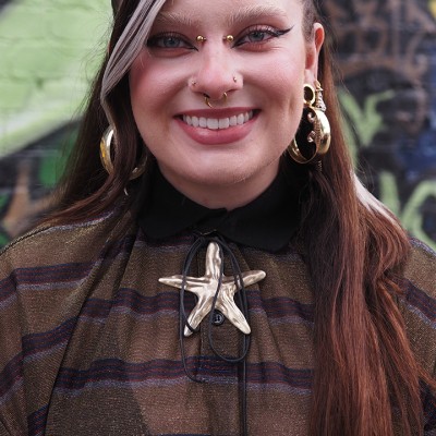 Smiling white person with long dark hair with chunky white streaks, multiple nose and ear piercings, wearing a brown striped shirt and a large metallic star necklace